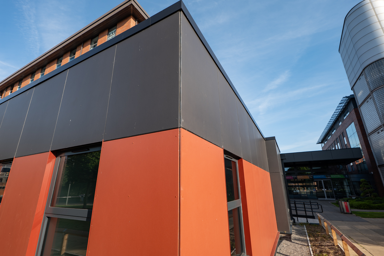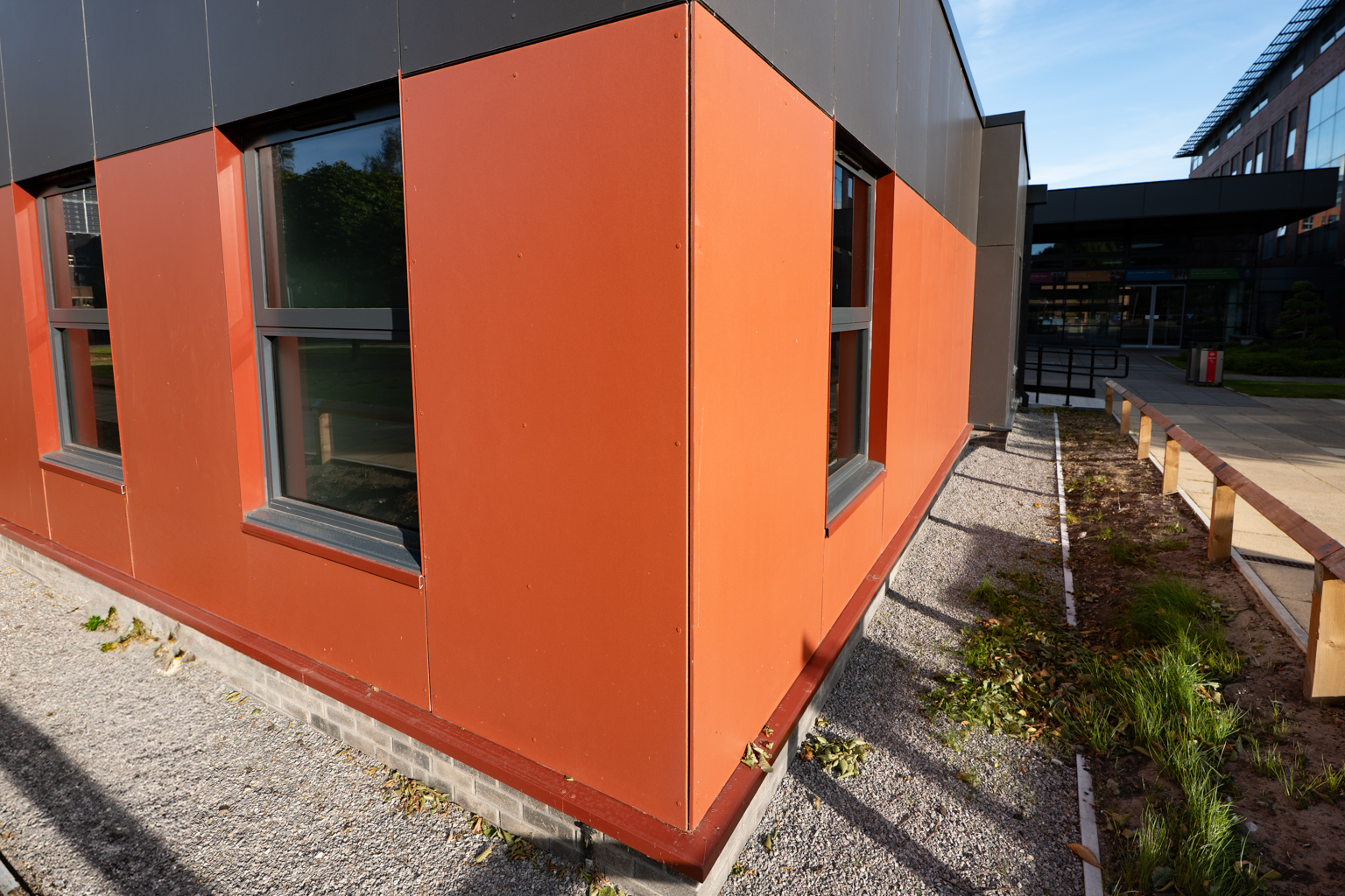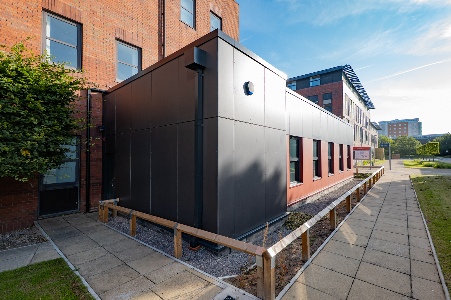 AMS Cladding installed an eye-catching charcoal and ruby rainscreen cladding system, providing aesthetics in keeping with their other developments, with thermal benefits.