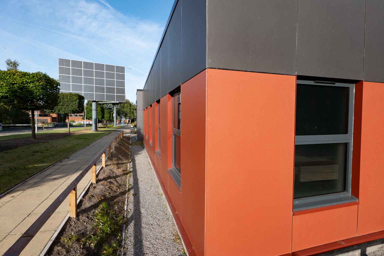 An Etex Rainscreen Cladding System comprising of Equitone Natura (Charcoal & Ruby) and A2 Certified cement panels on a face fixed subframe system were used, along with Rockwool Rainscreen Duo Slab insulation.